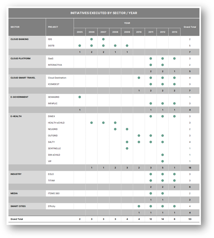 Along these lines, it´s important to identify the different initiatives undertaken in the R&D&I World and in particular review the results obtained and prospections -see Table below-, which occurred between the years 2005 and 2013, having executed 18 projects during 53 annuities in that period, especially notable due to the relevance of the decisions. strategies assumed opportunely by maat Group